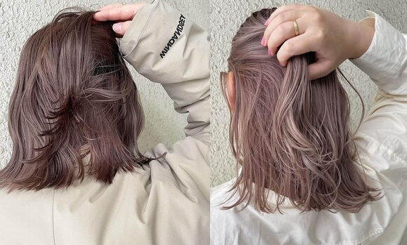 一方、ブリーチありの明るめのラベンダーグレージュはベージュに近い明度で、カジュアルで軽やかな印象に仕上がります。色落ちの変化はラベンダー→グレージュ→ベージュと段階的に変わっていくので、長くカラーを楽しみたい方にもぴったりです。