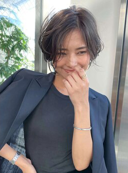 ▼また、8トーンほどのブルージュをひし形シルエットのボブに合わせると、透明感と上品さが際立つ大人カジュアルな印象に。